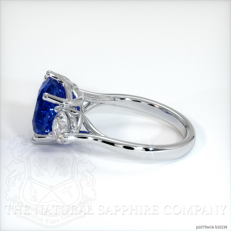 The ring features a beautiful, transparent GIA certified Blue 5.18 carat oval shape blue sapphire with the dimensions of 10.81 x 9.09 x 6.21 mm and a modified brilliant cut. It has a clarity grade of eye clean (evaluated at eye level), vivid color saturation, and an excellent polish. The origin of this sapphire is Ceylon (Sri Lanka).