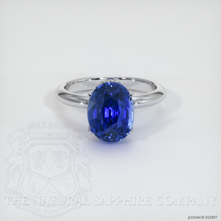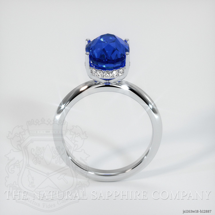 The ring features a beautiful, transparent AGL certified Blue 5.54 carat oval shape blue sapphire with the dimensions of 10.75 x 8.14 x 7.60 mm and a mixed brilliant cut. It has a clarity grade of very slightly included (evaluated at eye level), vivid color saturation, and an excellent polish. The origin of this sapphire is Ceylon (Sri Lanka).