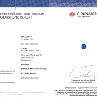 The men's ring features a beautiful, transparent C.Dunaigre certified Vivid Blue “Royal Blue” 5.67 carat oval shape blue sapphire with the dimensions of 11.73 x 9.07 x 6.52 mm and a mixed brilliant cut. It has a clarity grade of very slightly included (evaluated at eye level), vivid color saturation, and an excellent polish. The origin of this sapphire is Ceylon (Sri Lanka).