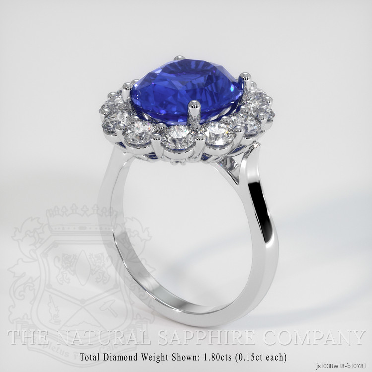 Also featured in the ring: White round shaped diamonds, weighing approx 1.80 carats, clarity VS1/VS2 and a color grade of E.