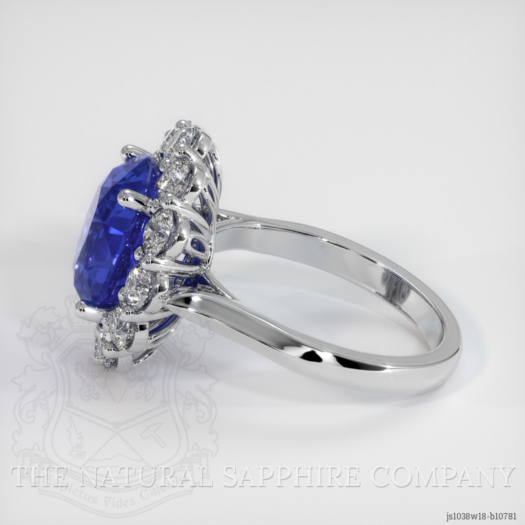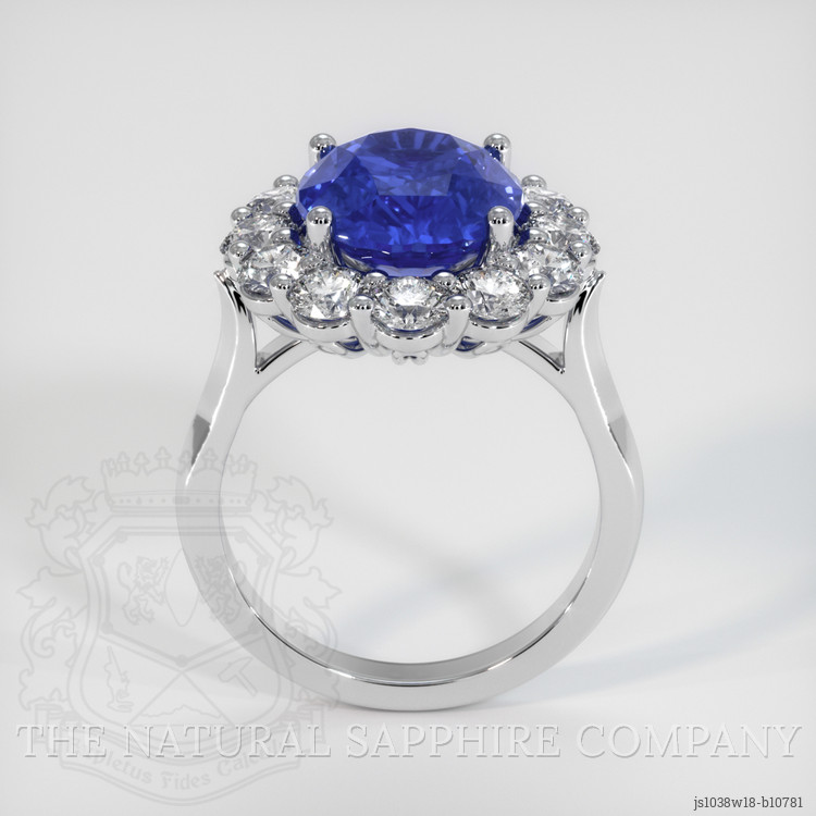 The ring features a beautiful, transparent C.Dunaigre certified Blue 5.70 carat oval shape blue sapphire with the dimensions of 11.53 x 9.86 x 5.94 mm and a mixed brilliant cut. It has a clarity grade of eye clean (evaluated at eye level), vivid color saturation, and an excellent polish. The origin of this sapphire is Ceylon (Sri Lanka).