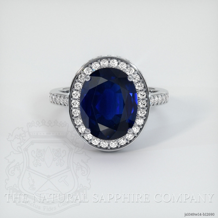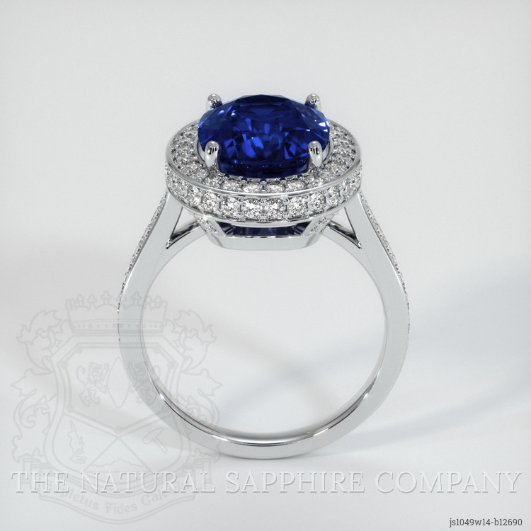 The ring features a beautiful, transparent 5.75 carat oval shape blue sapphire with the dimensions of 12.02 x 9.58 x 5.48 mm and a mixed brilliant cut. It has a clarity grade of eye clean (evaluated at eye level), vivid color saturation, and an excellent polish. The origin of this sapphire is Thailand.