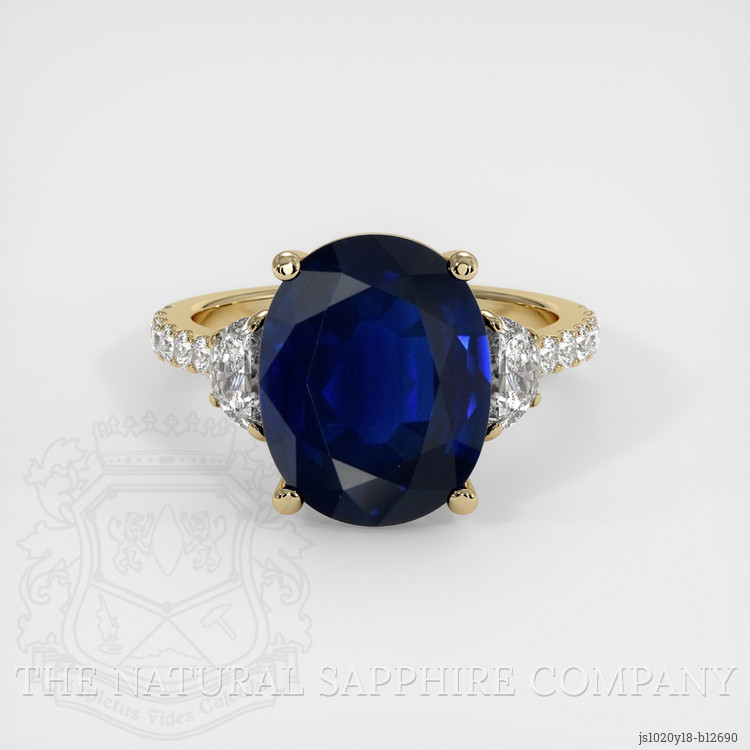 The ring features a beautiful, transparent 5.75 carat oval shape blue sapphire with the dimensions of 12.02 x 9.58 x 5.48 mm and a mixed brilliant cut. It has a clarity grade of eye clean (evaluated at eye level), vivid color saturation, and an excellent polish. The origin of this sapphire is Thailand.