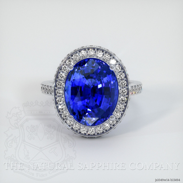The ring features a beautiful, transparent C.Dunaigre certified Vivid Blue “Cornflower Blue” 8.04 carat oval shape blue sapphire with the dimensions of 12.89 x 10.11 x 7.24 mm and a mixed brilliant cut. It has a clarity grade of eye clean (evaluated at eye level), vivid color saturation, and an excellent polish. The origin of this sapphire is Ceylon (Sri Lanka).