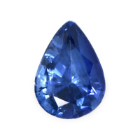The ring features a beautiful, transparent 0.98 carat pear shape blue sapphire with the dimensions of 6.99 x 5.02 x 3.91 mm and a mixed brilliant cut. It has a clarity grade of very slightly included (evaluated at eye level), intense color saturation, and an excellent polish. The origin of this sapphire is Ceylon (Sri Lanka).