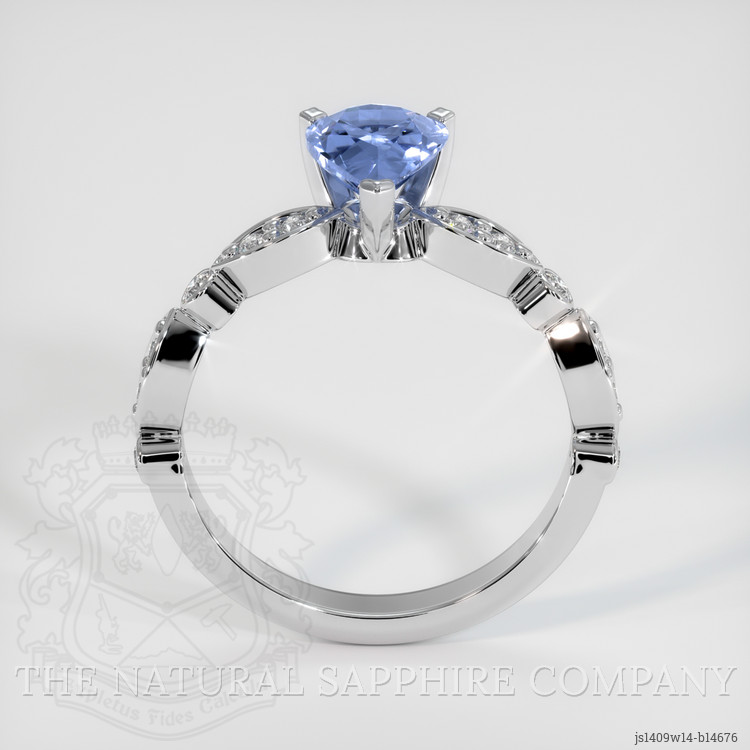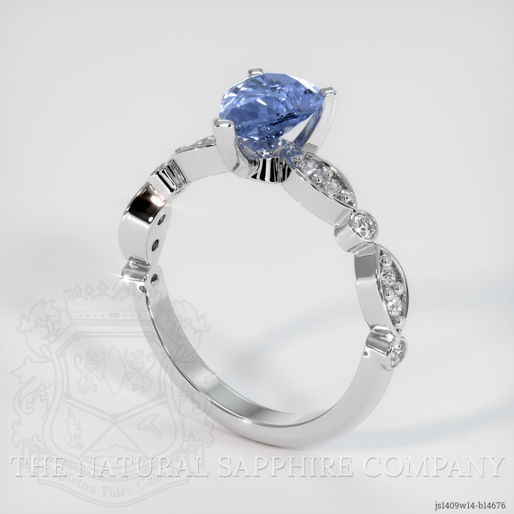 The ring features a beautiful, transparent 1.11 carat pear shape blue sapphire with the dimensions of 7.89 x 5.76 x 3.75 mm and a mixed brilliant cut. It has a clarity grade of very slightly included (evaluated at eye level), medium light color saturation, and an excellent polish. The origin of this sapphire is Ceylon (Sri Lanka).