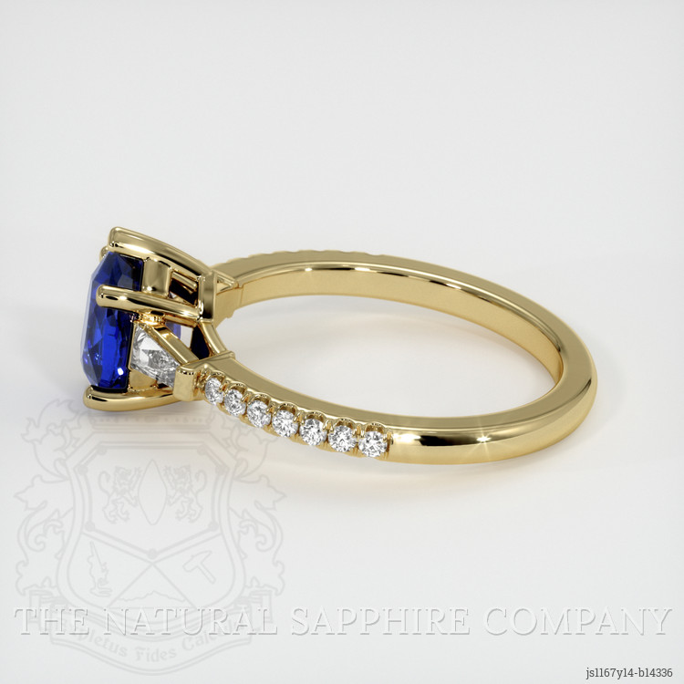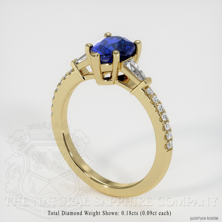 The ring features a beautiful, transparent 1.30 carat pear shape blue sapphire with the dimensions of 7.32 x 5.33 x 4.16 mm and a mixed brilliant cut. It has a clarity grade of eye clean (evaluated at eye level), vivid color saturation, and an excellent polish. The origin of this sapphire is Ceylon (Sri Lanka).