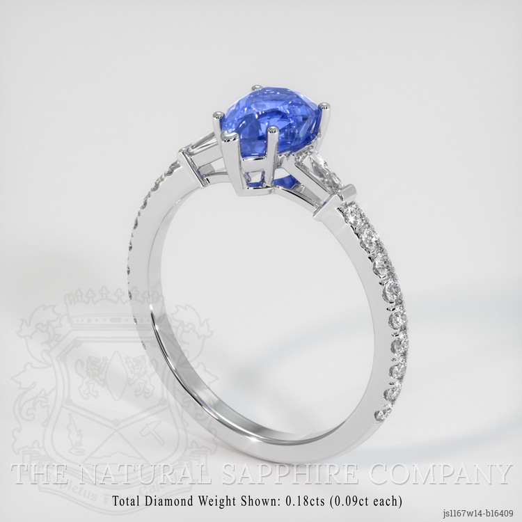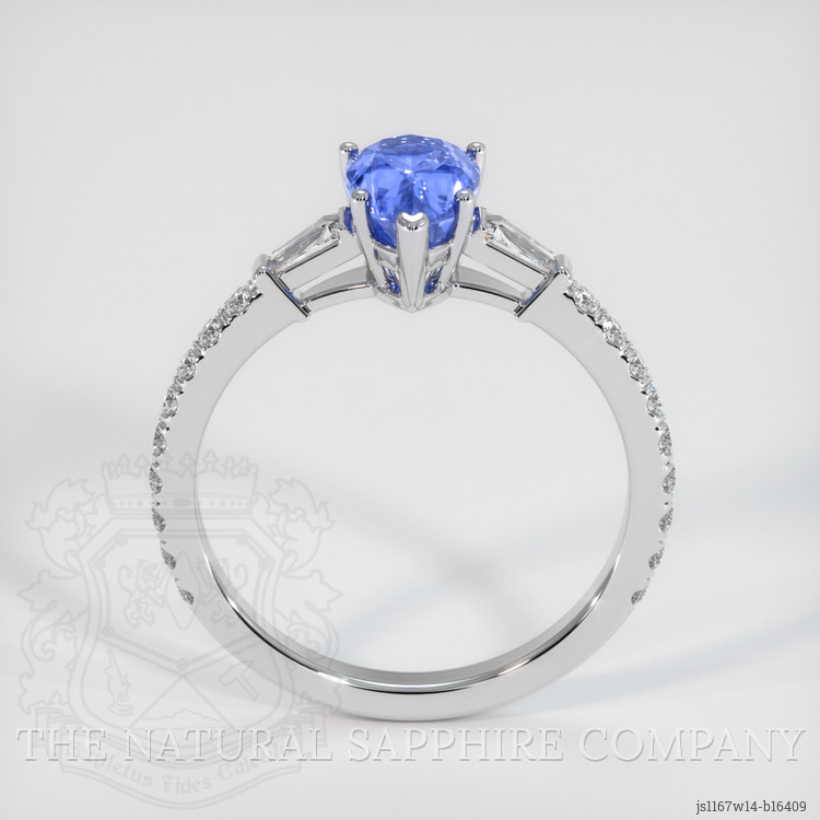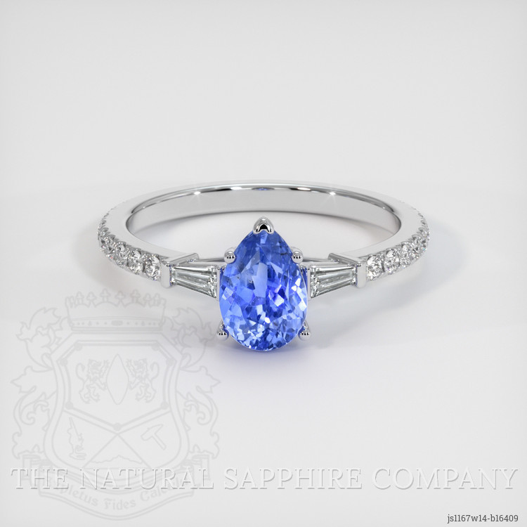 The ring features a beautiful, transparent 1.81 carat pear shape blue sapphire with the dimensions of 7.89 x 5.52 x 4.92 mm and a mixed brilliant cut. It has a clarity grade of eye clean (evaluated at eye level), medium intense color saturation, and an excellent polish. The origin of this sapphire is Ceylon (Sri Lanka).