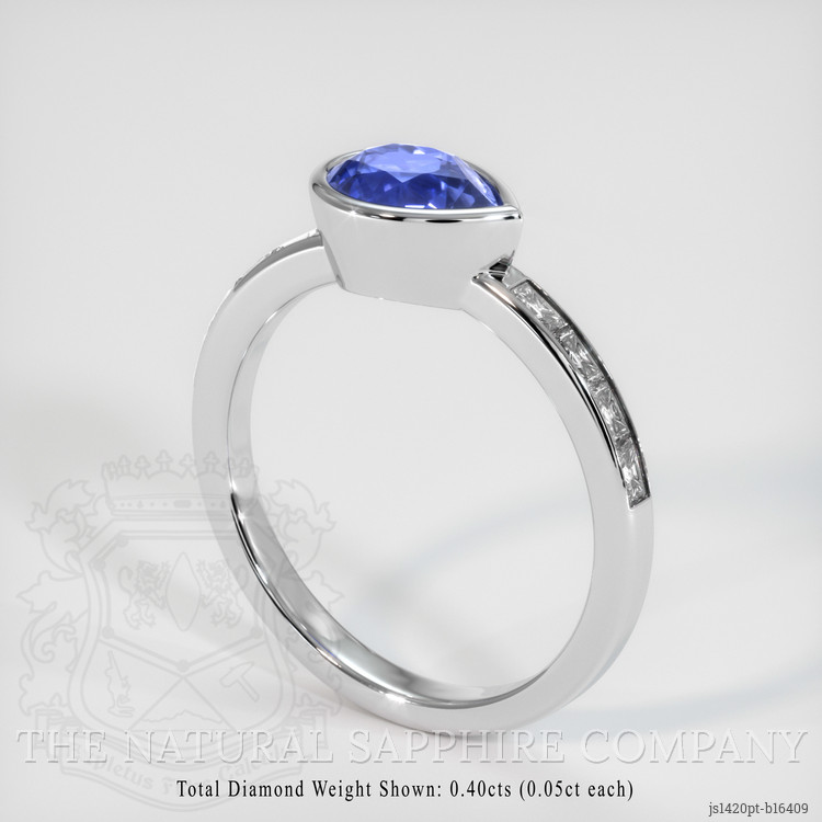 The ring features a beautiful, transparent 1.81 carat pear shape blue sapphire with the dimensions of 7.89 x 5.52 x 4.92 mm and a mixed brilliant cut. It has a clarity grade of eye clean (evaluated at eye level), medium intense color saturation, and an excellent polish. The origin of this sapphire is Ceylon (Sri Lanka).