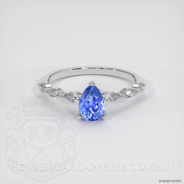 The ring features a beautiful, transparent 1.81 carat pear shape blue sapphire with the dimensions of 7.89 x 5.52 x 4.92 mm and a mixed brilliant cut. It has a clarity grade of eye clean (evaluated at eye level), medium intense color saturation, and an excellent polish. The origin of this sapphire is Ceylon (Sri Lanka).