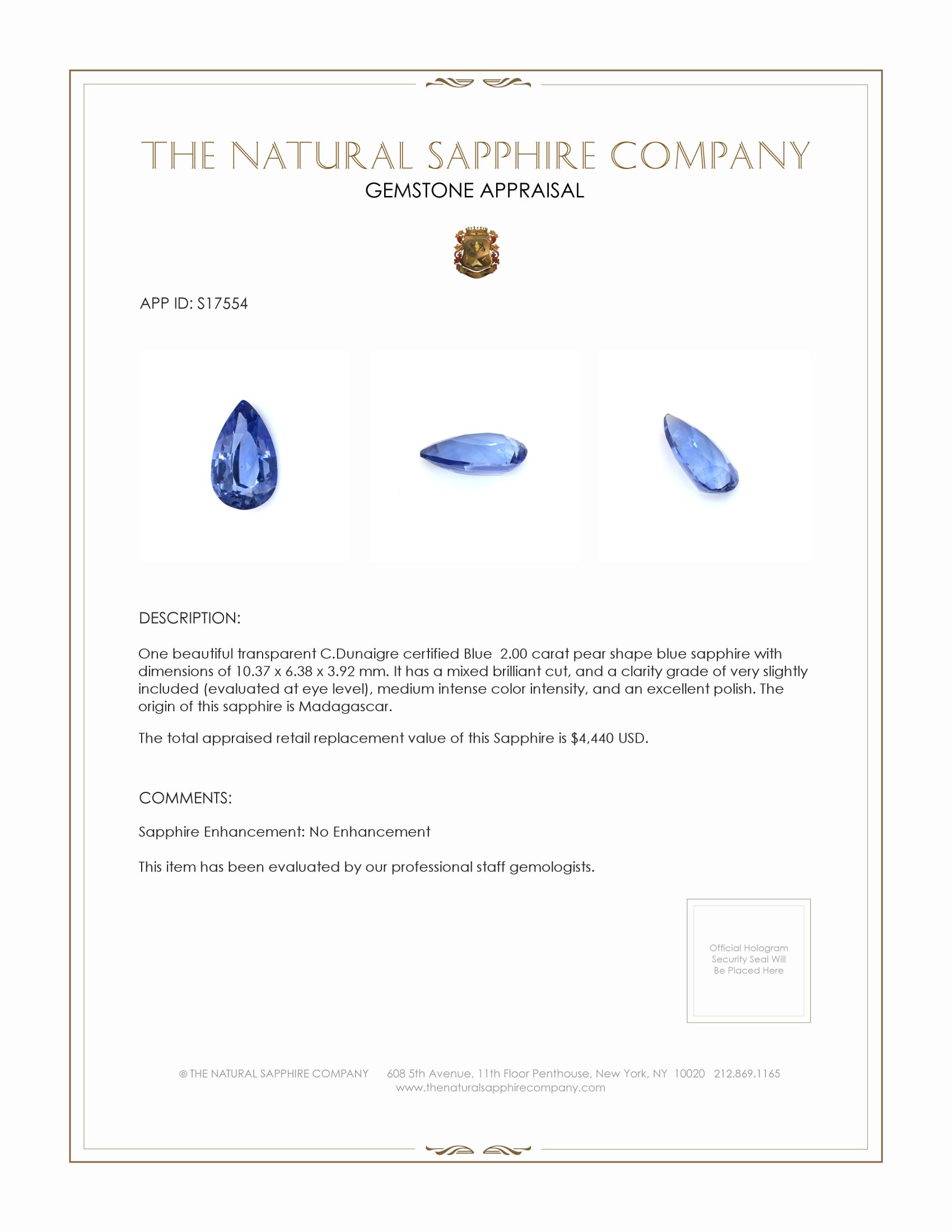 Discover the epitome of elegance with our stunning signature piece from The Natural Sapphire Company. This breathtaking ring features a C.Dunaigre certified blue sapphire, expertly crafted to enhance any attire. With a captivating 2.00 carat pear-shaped sapphire as its centerpiece, this ring provides both an arresting and sophisticated charm to anyone who adorns it. The sapphire’s medium intense color saturation beautifully reflects the hues of Madagascar, presenting a piece that is both exotic and uniquely yours.