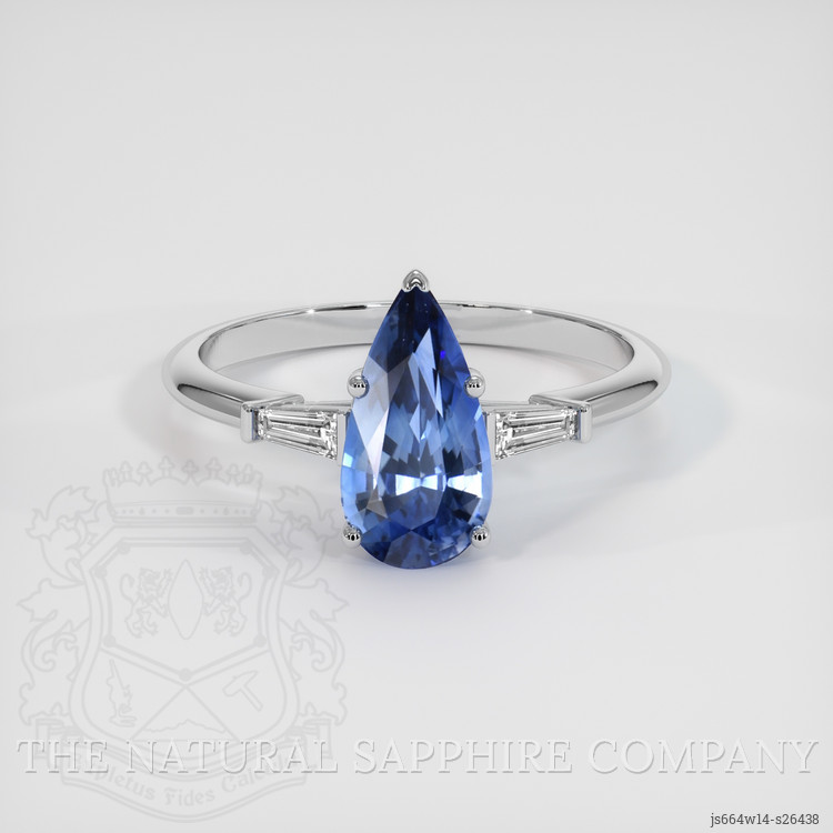 Indulge in the exquisite allure of our latest offering from The Natural Sapphire Company. This ring, a masterful creation set in luxurious 14K white gold, is more than a mere adornment. It is a symbol of transformation, capturing the essence of a new beginning and enveloping it in timeless elegance. At its heart lies a mesmerizing 2.36 carat pear-shaped blue sapphire, a gem of remarkable beauty sourced from the legendary mines of Ceylon, Sri Lanka. This sapphire is a marvel of nature, boasting dimensions of 11.57 x 5.96 x 4.73 mm, with a mixed brilliant cut that refracts light into a dazzling display. Its eye-clean clarity and medium intense color saturation create an enchanting depth, while the untouched purity of its unenhanced allure speaks of authenticity and unspoiled natural majesty.