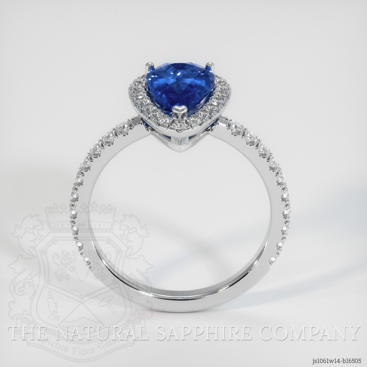The ring features a beautiful, transparent GIA certified Blue 2.70 carat pear shape blue sapphire with the dimensions of 11.99 x 6.43 x 4.43 mm and a mixed brilliant cut. It has a clarity grade of eye clean (evaluated at eye level), intense color saturation, and an excellent polish. The origin of this sapphire is Ceylon (Sri Lanka).