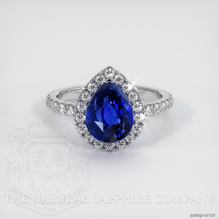 The ring features a beautiful, transparent 3.07 carat pear shape blue sapphire with the dimensions of 9.35 x 6.91 x 5.67 mm and a mixed brilliant cut. It has a clarity grade of very slightly included (evaluated at eye level), vivid color saturation, and an excellent polish. The origin of this sapphire is Ceylon (Sri Lanka).