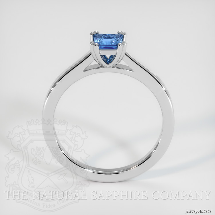 The ring features a beautiful, transparent 0.44 carat princess shape blue sapphire with the dimensions of 4.15 x 4.12 x 2.97 mm and a princess cut. It has a clarity grade of eye clean (evaluated at eye level), medium intense color saturation, and an excellent polish. The origin of this sapphire is Ceylon (Sri Lanka).