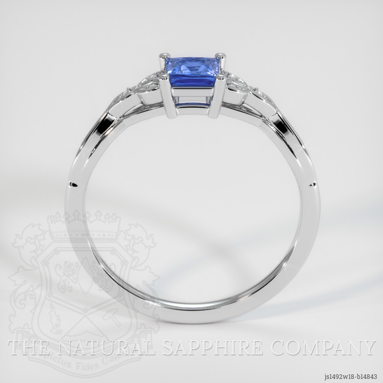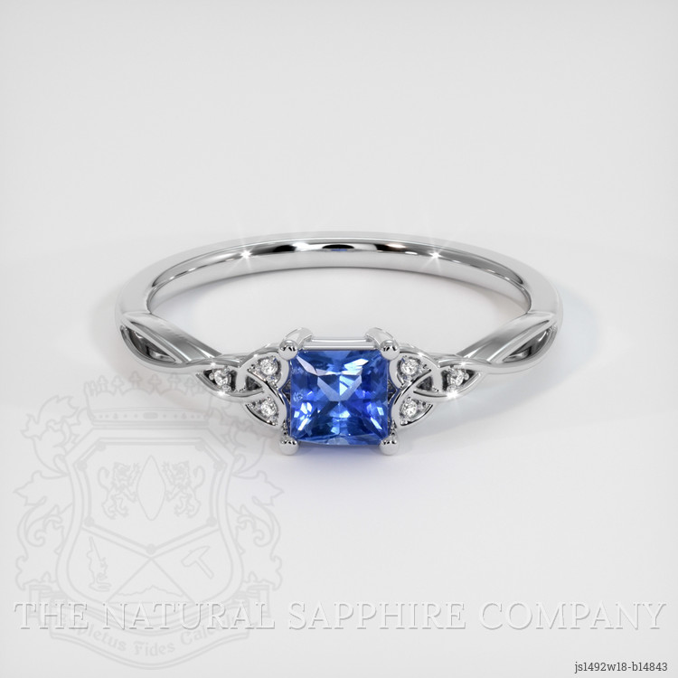 The ring features a beautiful, transparent 0.54 carat princess shape blue sapphire with the dimensions of 4.49 x 4.43 x 3.04 mm and a princess cut. It has a clarity grade of very slightly included (evaluated at eye level), intense color saturation, and an excellent polish. The origin of this sapphire is Ceylon (Sri Lanka).