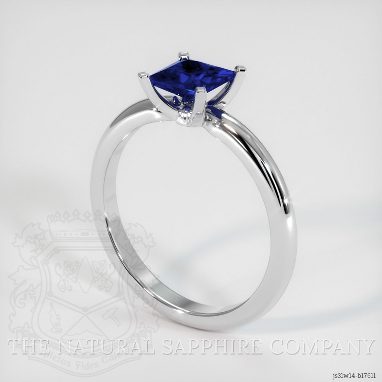 The ring features a beautiful, transparent 1.15 carat princess shape blue sapphire with the dimensions of 6.05 x 6.03 x 3.09 mm and a princess cut. It has a clarity grade of eye clean (evaluated at eye level), vivid color saturation, and an excellent polish. The origin of this sapphire is Ceylon (Sri Lanka).