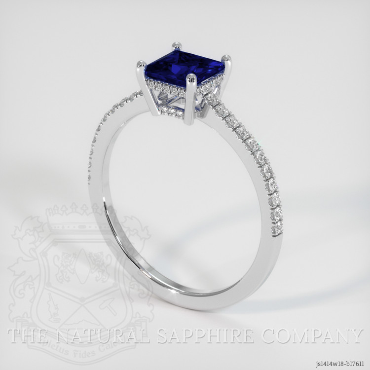 The ring features a beautiful, transparent 1.15 carat princess shape blue sapphire with the dimensions of 6.05 x 6.03 x 3.09 mm and a princess cut. It has a clarity grade of eye clean (evaluated at eye level), vivid color saturation, and an excellent polish. The origin of this sapphire is Ceylon (Sri Lanka).