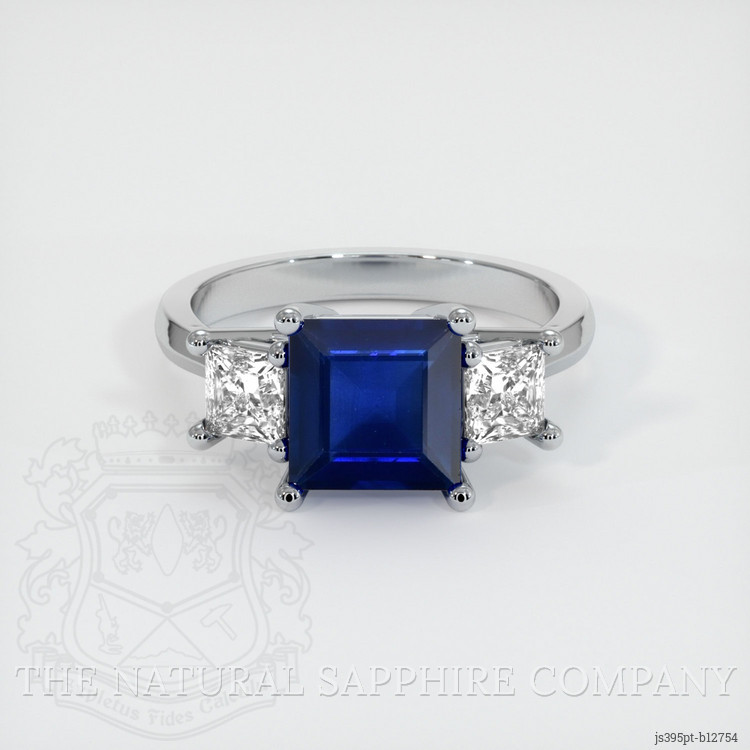 The ring features a beautiful, transparent 1.94 carat princess shape blue sapphire with the dimensions of 7.30 x 7.29 x 3.59 mm and a step cut. It has a clarity grade of eye clean (evaluated at eye level), vivid color saturation, and an excellent polish. The origin of this sapphire is Thailand.