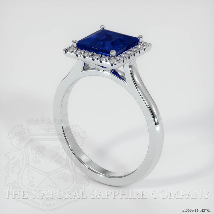 The ring features a beautiful, transparent 2.19 carat princess shape blue sapphire with the dimensions of 7.04 x 7.04 x 4.51 mm and a step cut. It has a clarity grade of eye clean (evaluated at eye level), vivid color saturation, and an excellent polish. The origin of this sapphire is Thailand.