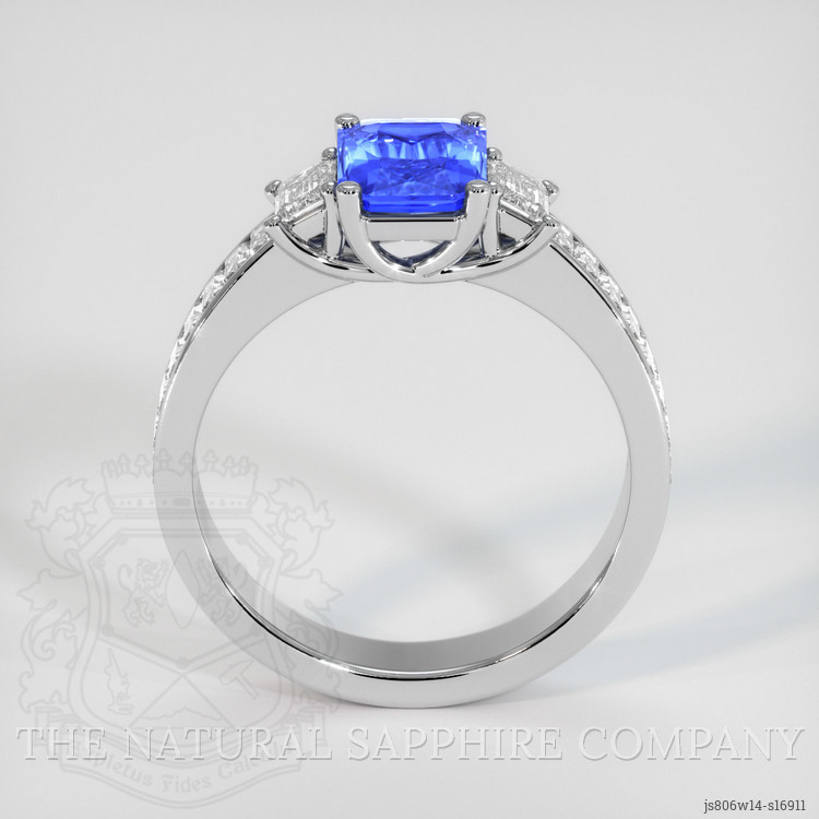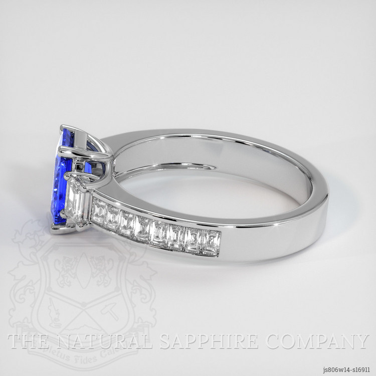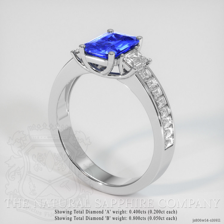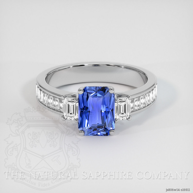 Crafted artfully around the sapphire, the ring features an assembly of white diamonds, enhancing the central stone's natural allure. The ring incorporates carefully selected emerald-cut diamonds, weighing approximately 0.40 carats in total, each possessing a clarity grade of VS1 to VS2. With a color grade of E, these diamonds reflect a near-perfect white, adding a layer of brilliance to the ring's overall aesthetic. Furthermore, the design is thoughtfully accentuated by baguette-shaped diamonds. These exquisite stones contribute an additional approximate weight of 0.80 carats, offering clarity and purity that match their brilliant counterparts, thus creating a cohesive and harmonious visual appeal.