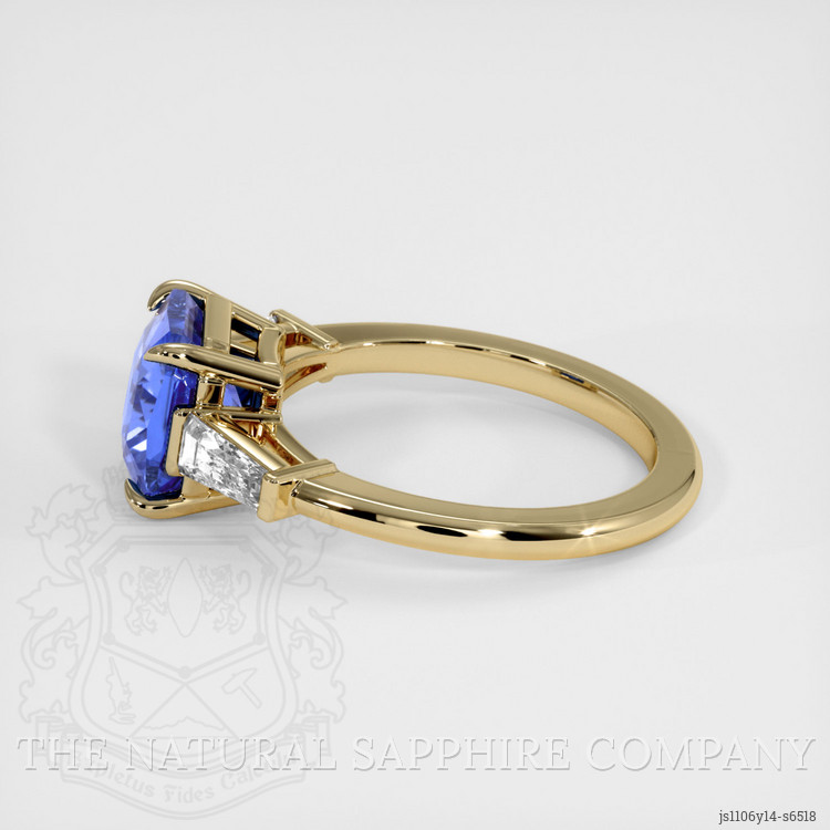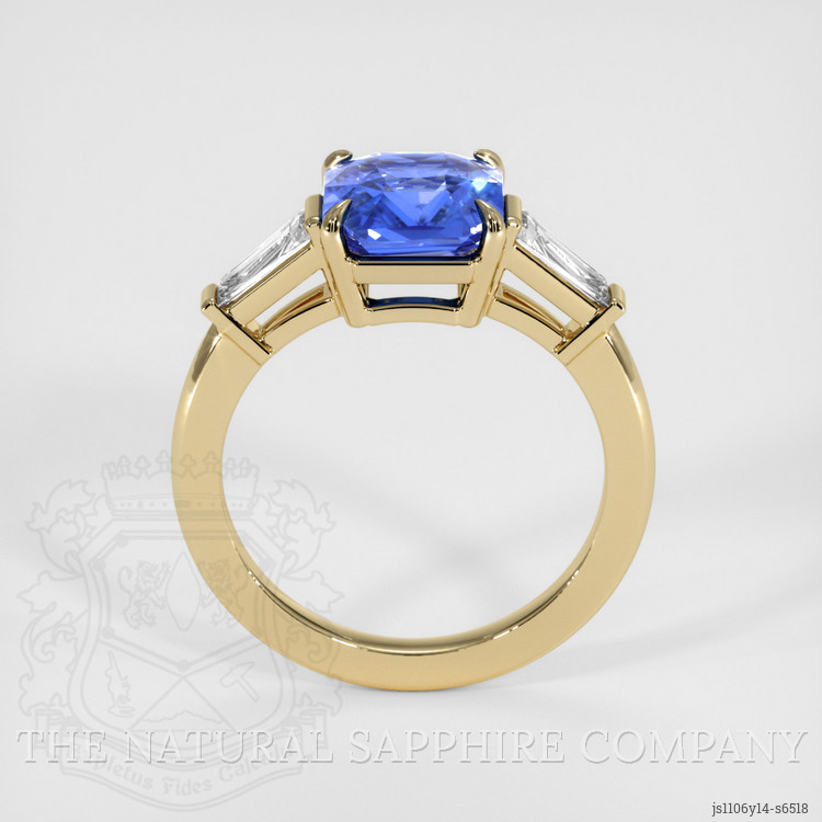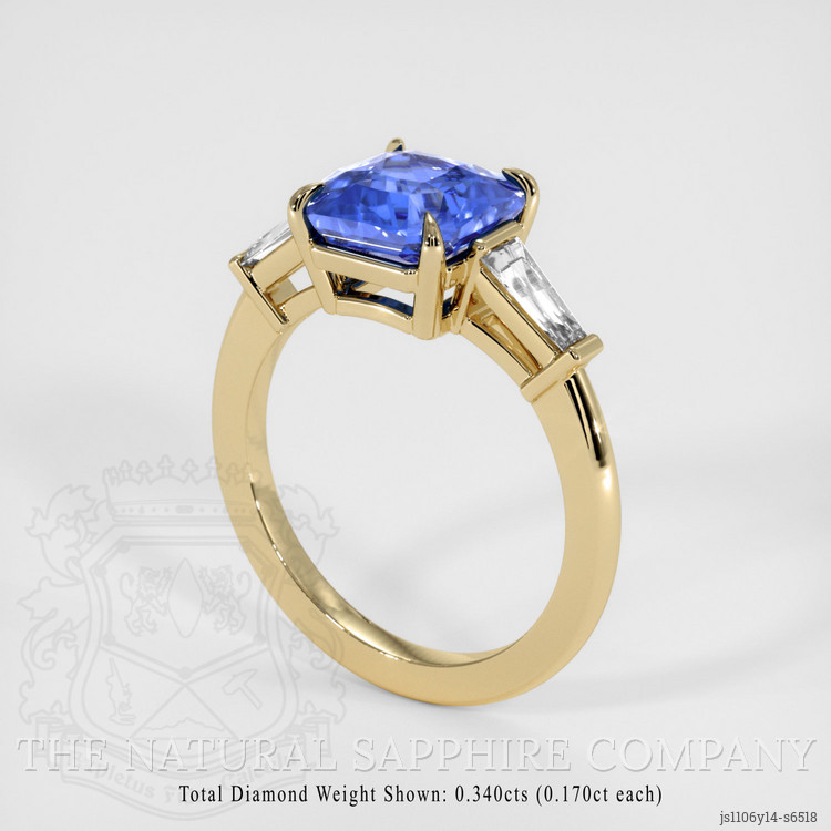 The design of this exquisite ring is no mere setting; it is a tribute to the beauty of the sapphire it cradles. The 14K yellow gold band encircles the finger with warmth and contrast, highlighting the rich blue of the center stone and amplifying its allure. Flanking this sapphire are two impeccably cut white baguette diamonds, totaling approximately 0.34 carats. Their clarity, rated at VS1 and VS2, combined with an impressive color grade of E, ensures they reflect light with extraordinary brilliance. The tapered design of these diamonds draws the eye naturally towards the sapphire, making it the focal point of this luxurious creation, a true testament to timeless sophistication.