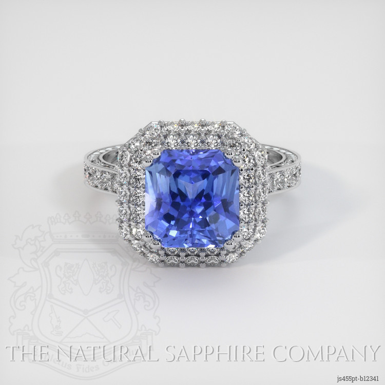 The ring features a beautiful, transparent C.Dunaigre certified Blue 3.66 carat radiant shape blue sapphire with the dimensions of 8.54 x 8.05 x 5.87 mm and a modified brilliant cut. It has a clarity grade of eye clean (evaluated at eye level), intense color saturation, and an excellent polish. The origin of this sapphire is Ceylon (Sri Lanka).