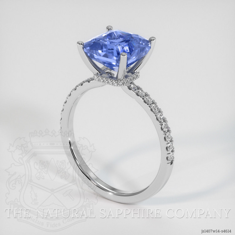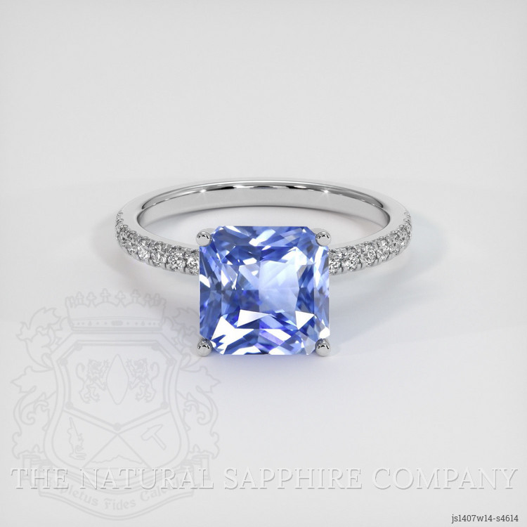 The ring features a beautiful, transparent 4.08 carat radiant shape blue sapphire with the dimensions of 8.45 x 8.39 x 5.68 mm and a radiant cut. It has a clarity grade of eye clean (evaluated at eye level), medium color saturation, and an excellent polish. The origin of this sapphire is Ceylon (Sri Lanka).