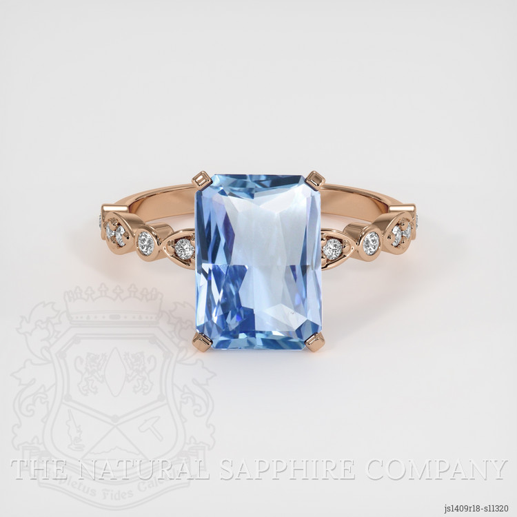The sapphire and diamonds are set in a band of 14K rose gold, chosen to enhance the overall warmth and sophistication of the ring. The rose gold setting not only adds a romantic blush tone but also creates a harmonious balance with the icy diamonds and the cool blue sapphire. This blend of colors and materials creates an elegant framework that speaks to the timeless symbol of love and commitment. The workmanship seen in the faceting and the setting highlights our dedication to creating a piece that is both beautiful and enduring.