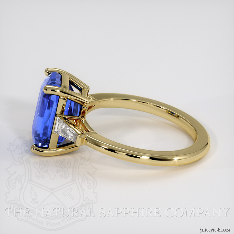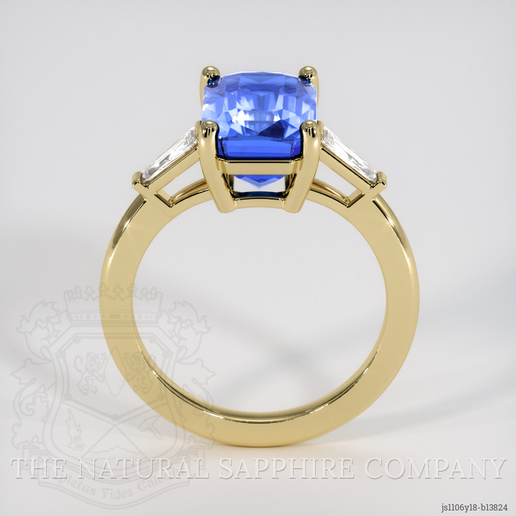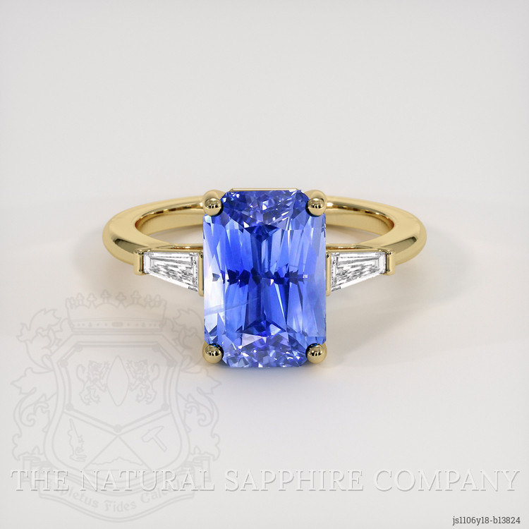 The side stones in this ring are natural white tapered baguette diamonds totaling approximately 0.34 carats, graded at Very Slightly Included VS1 VS2, with a color grade of E, and they are set to compliment rather than compete with the central sapphire. Those diamonds offer exceptional contrast to the sapphire s intense blue because their high color grade maintains neutral white light while their VS clarity ensures that little or no internal distraction is visible without magnification. From a gemological standpoint the diamonds act as a precision frame that increases perceived size and brightness of the center stone, particularly because tapered baguettes present clean linear reflections that lead the eye toward the sapphire. Combined with the radiant cut of the sapphire which blends step and brilliant style facet arrangements, the overall optical effect is a refined balance between bold color and crisp, architectural sparkle. Setting the ensemble in 18K yellow gold warms the blue hue in a way that many connoisseurs prefer for medium to vivid Ceylon blues, because the warm metal tones enhance contrast and add a classic, timeless feel that suits both modern and traditional aesthetics.