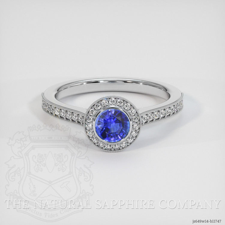 Indulge in the timeless allure of sophistication with our exquisite sapphire and diamond ring, a masterpiece curated by The Natural Sapphire Company. Impeccably crafted, this ring features a ravishing 0.94-carat round blue sapphire, renowned for its captivating transparency and radiant brilliance. With dimensions of 5.56 x 5.53 x 3.81 mm and a brilliant cut, this sapphire is a symbol of perfection, showcasing an eye-clean clarity that evokes pure elegance. Sourced from the legendary sapphire mines of Ceylon, the stone's intense color saturation invites a rich interplay of light and shade, culminating in an enthralling color that is both rare and irresistible.