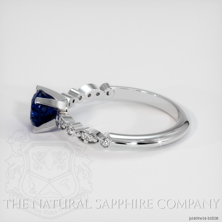 The ring features a beautiful, transparent 1.05 carat round shape blue sapphire with the dimensions of 5.81 x 5.75 x 4.03 mm and a mixed brilliant cut. It has a clarity grade of very slightly included (evaluated at eye level), dark color saturation, and an excellent polish. The origin of this sapphire is Nigeria.