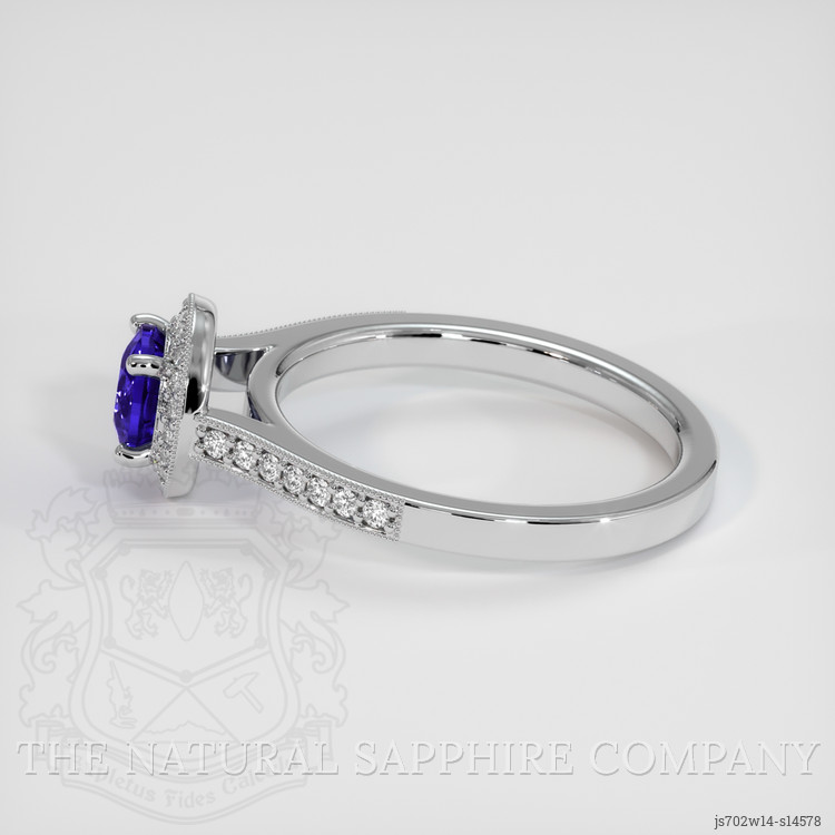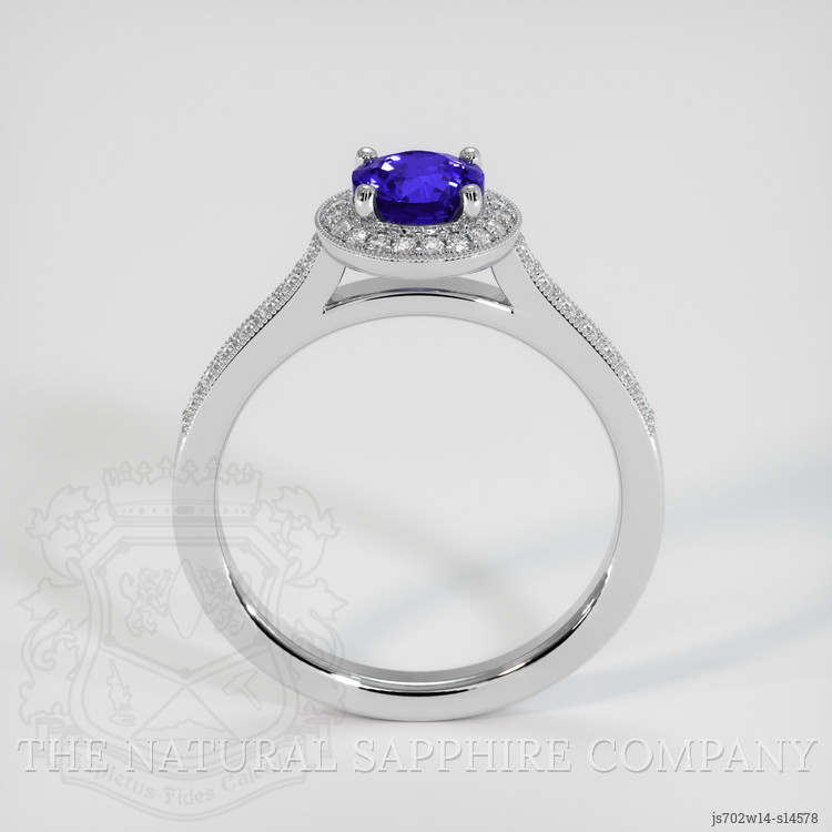 Accompanying the sapphire are carefully selected white round shaped diamonds, adding an air of subtle luxury to the ring. The diamonds, weighing approximately 0.105 carats and 0.12 carats respectively, boast a clarity grade of VS1/VS2 and a color grade of F. These diamonds are designed to perfectly complement the centerpiece sapphire, providing multiple facets that sparkle from every angle. Each diamond is chosen for its ability to harmonize with the sapphire, enhancing the overall brilliance and elegance of the ring. The setting in 14K white gold provides a timeless backdrop, not only serving as a testament to craftsmanship but also significantly heightening the sapphire’s vibrancy and the diamonds’ shimmer.