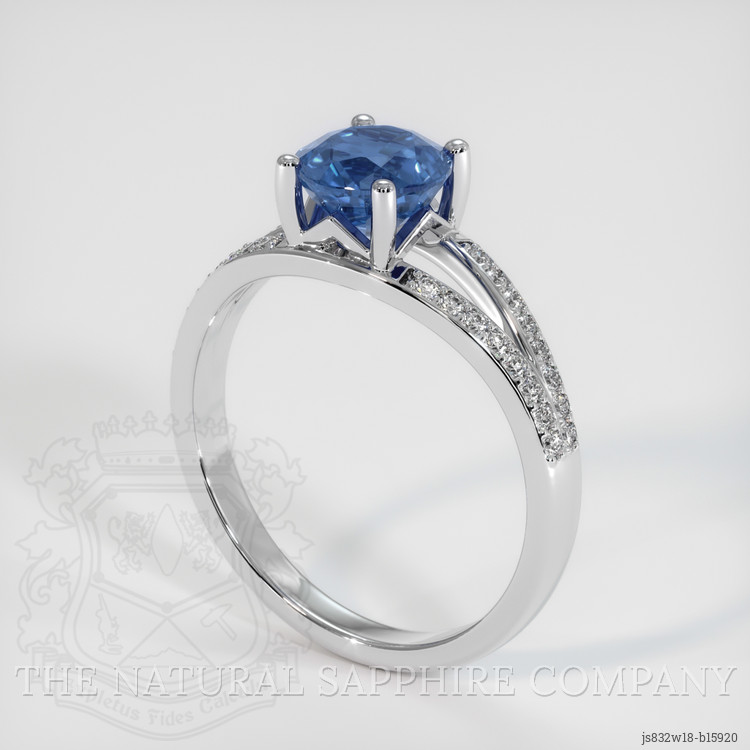 The ring features a beautiful, transparent 1.20 carat round shape blue sapphire with the dimensions of 6.06 x 5.99 x 4.00 mm and a mixed brilliant cut. It has a clarity grade of eye clean (evaluated at eye level), intense color saturation, and an excellent polish. The origin of this sapphire is Ceylon (Sri Lanka).