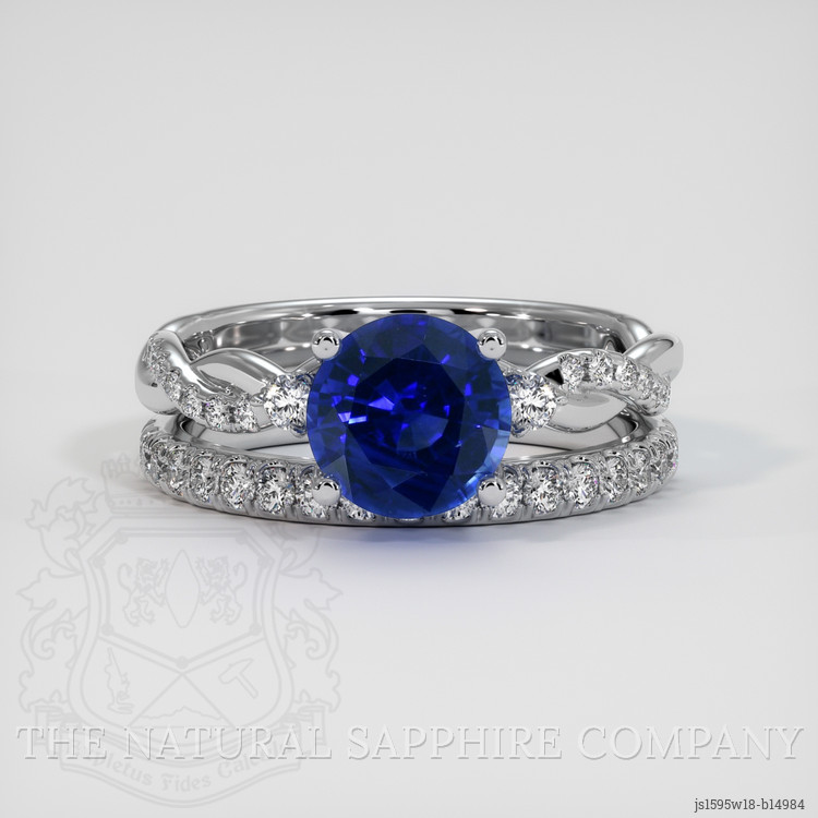 The ring features a beautiful, transparent 1.21 carat round shape blue sapphire with the dimensions of 6.49 x 6.40 x 3.86 mm and a mixed brilliant cut. It has a clarity grade of eye clean (evaluated at eye level), vivid color saturation, and an excellent polish. The origin of this sapphire is Ceylon (Sri Lanka).
