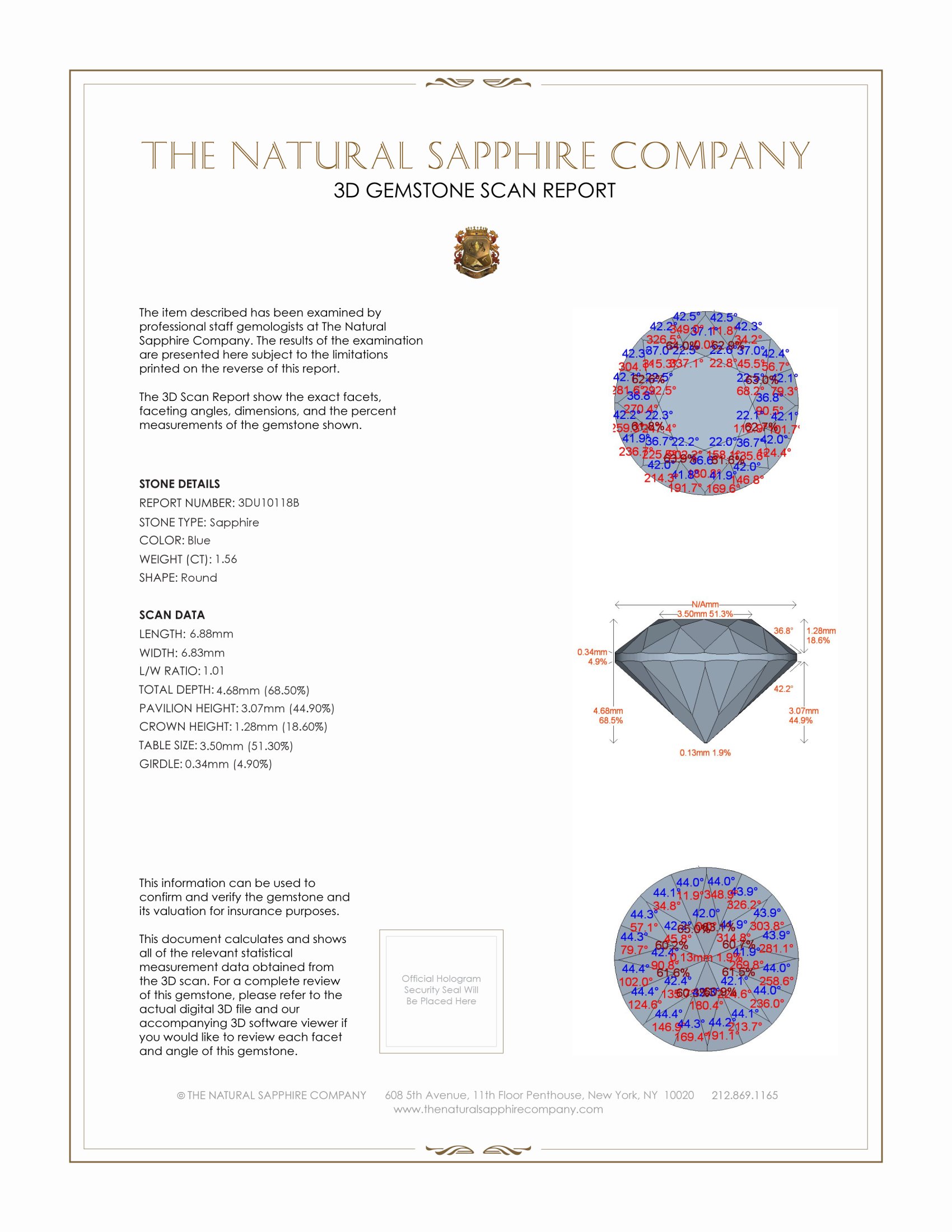 The ring features a beautiful, transparent 1.56 carat round shape bluish green sapphire with the dimensions of 6.88 x 6.83 x 4.68 mm and a brilliant cut. It has a clarity grade of very slightly included (evaluated at eye level), intense color saturation, and an excellent polish. The origin of this sapphire is Montana.