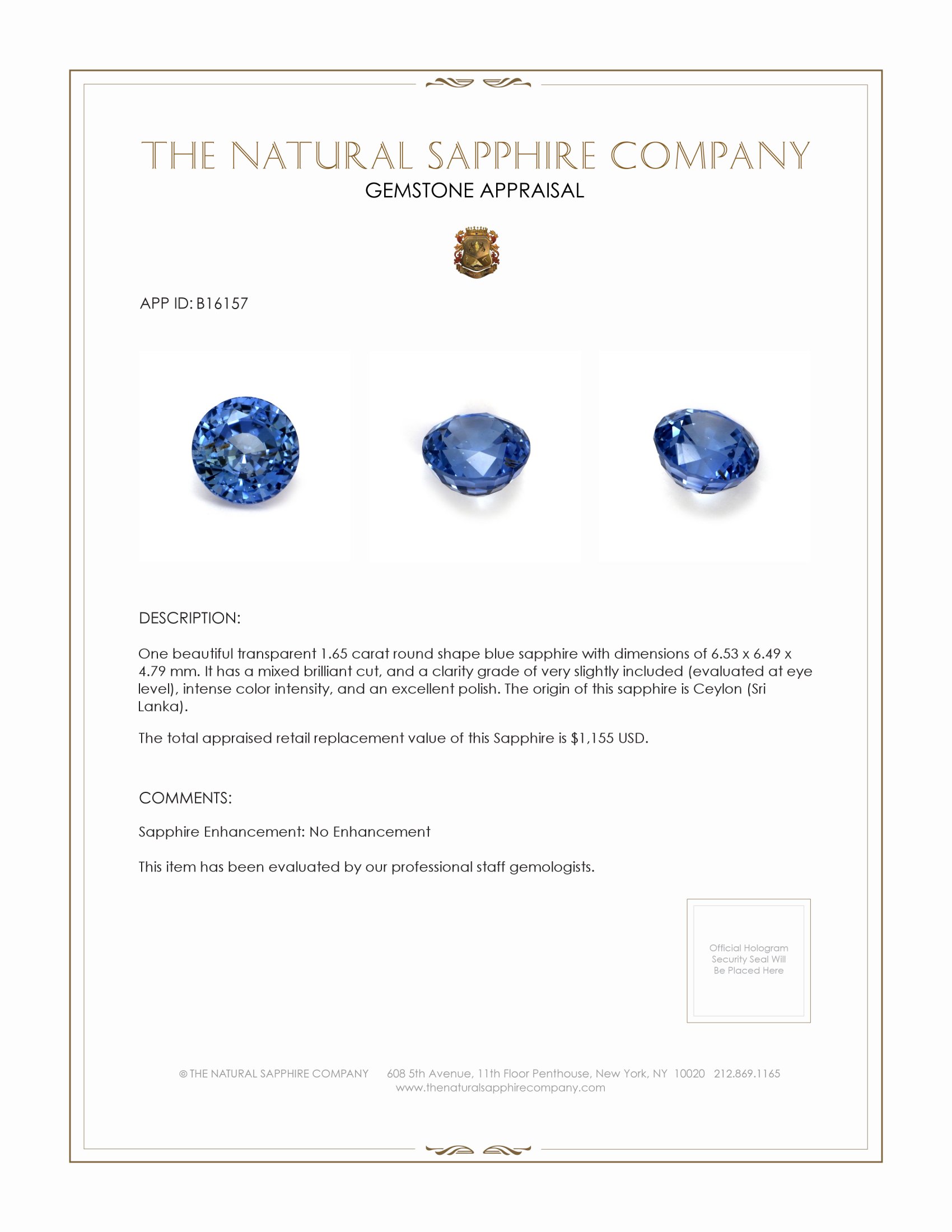 The ring features a beautiful, transparent 1.65 carat round shape blue sapphire with the dimensions of 6.53 x 6.49 x 4.79 mm and a mixed brilliant cut. It has a clarity grade of very slightly included (evaluated at eye level), intense color saturation, and an excellent polish. The origin of this sapphire is Ceylon (Sri Lanka).