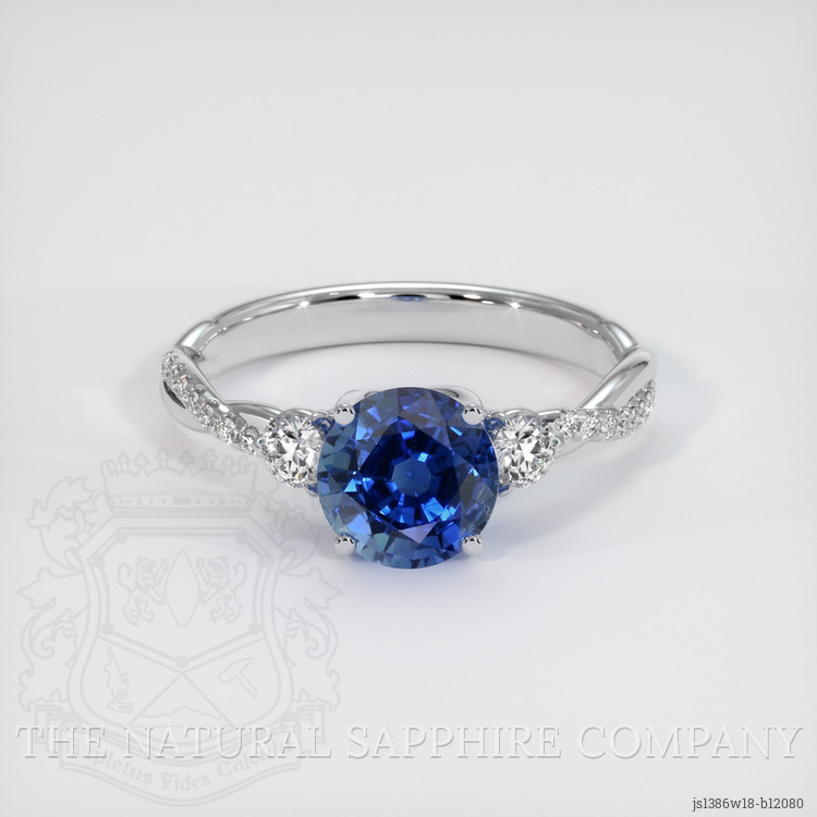 The ring features a beautiful, transparent C.Dunaigre certified Vivid Blue 1.84 carat round shape blue sapphire with the dimensions of 7.13 x 7.09 x 4.57 mm and a mixed brilliant cut. It has a clarity grade of very slightly included (evaluated at eye level), vivid color saturation, and an excellent polish. The origin of this sapphire is West Africa.