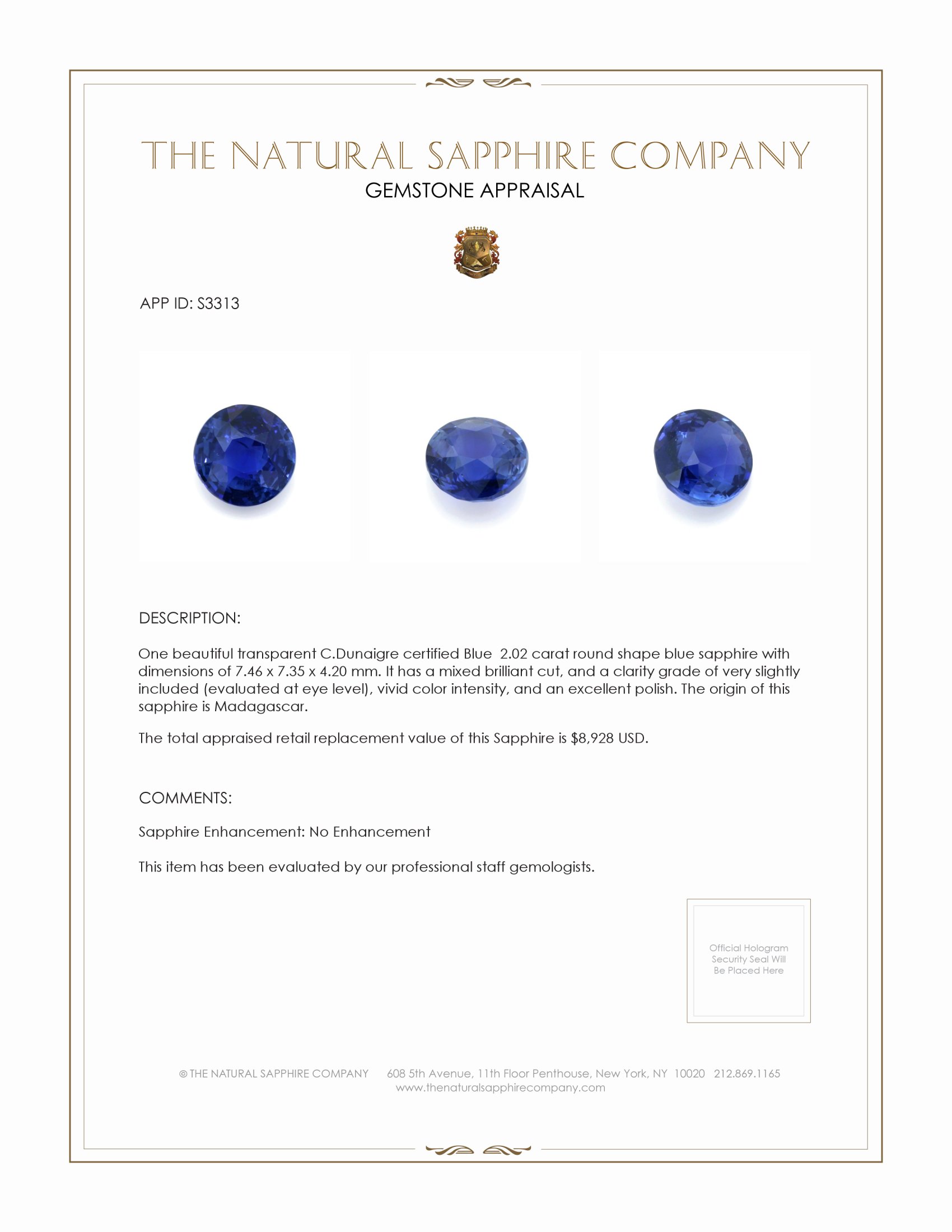 The centerpiece of this extraordinary ring is a stunning, transparent C.Dunaigre certified blue sapphire. Weighing 2.02 carats, this round shape gem originates from the rich terrains of Madagascar, known for producing stones of deep, vivid color saturation. Its dimensions of 7.46 x 7.35 x 4.20 mm and the mixed brilliant cut ensure maximum brilliance. The clarity grade of very slightly included, evaluated at eye level, allows the natural beauty of the sapphire to shine through while maintaining uniqueness and character. Surrounded by this brilliance, the sapphire radiates with every movement, captivating onlookers with its deep blue hue.