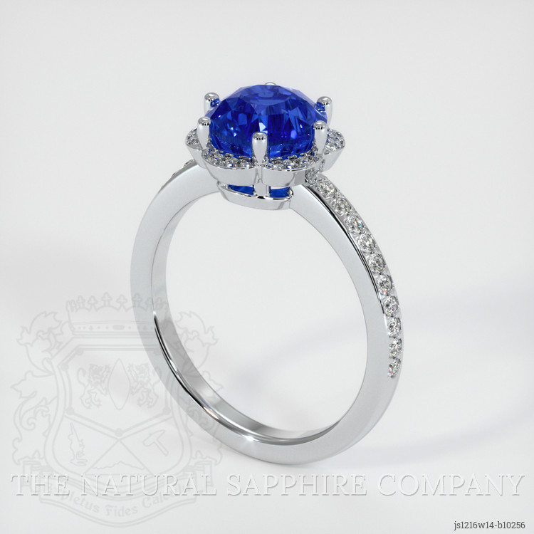 The ring features a beautiful, transparent 2.91 carat round shape blue sapphire with the dimensions of 7.78 x 7.65 x 6.14 mm and a mixed brilliant cut. It has a clarity grade of very slightly included (evaluated at eye level), vivid color saturation, and an excellent polish. The origin of this sapphire is Ceylon (Sri Lanka).