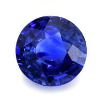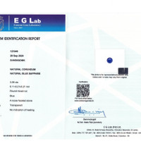 The ring features a beautiful, transparent 3.09 carat round shape blue sapphire with the dimensions of 8.26 x 8.07 x 5.24 mm and a mixed brilliant cut. It has a clarity grade of very slightly included (evaluated at eye level), vivid color saturation, and an excellent polish. The origin of this sapphire is Ceylon (Sri Lanka).
