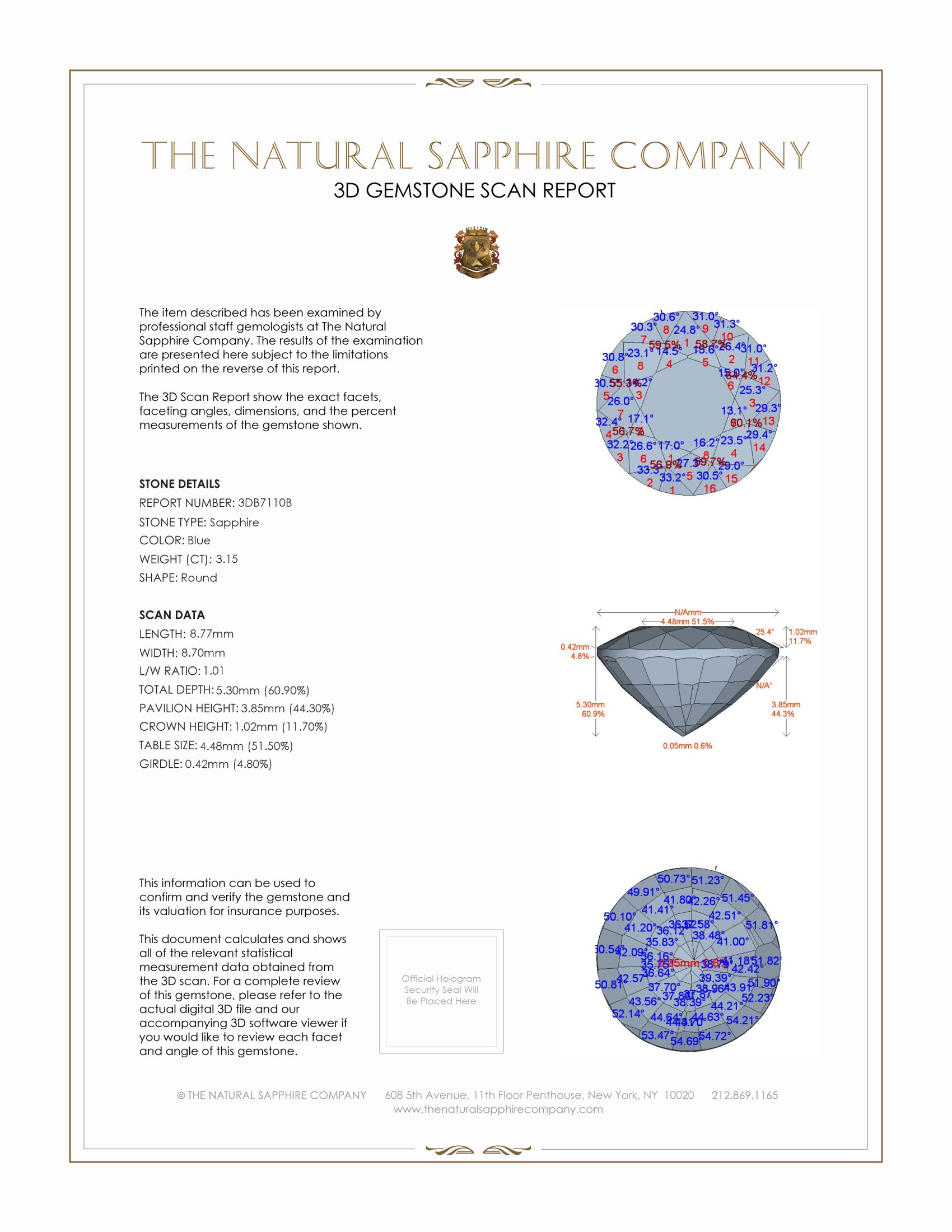 The ring features a beautiful, transparent 3.15 carat round shape blue sapphire with the dimensions of 8.77 x 8.70 x 5.30 mm and a mixed brilliant cut. It has a clarity grade of very slightly included (evaluated at eye level), intense color saturation, and an excellent polish. The origin of this sapphire is Ceylon (Sri Lanka).