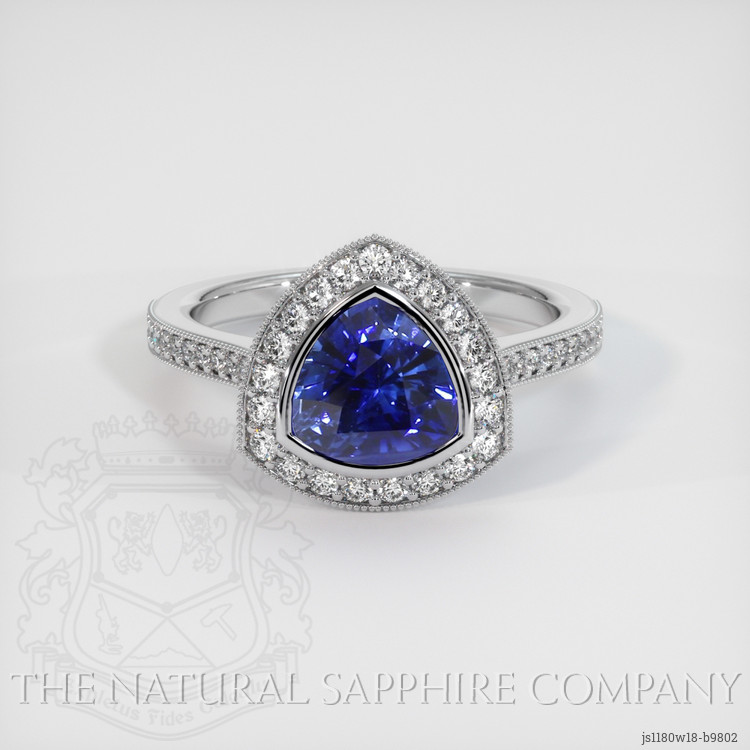 The ring features a beautiful, transparent 2.68 carat trillion shape blue sapphire with the dimensions of 8.33 x 8.17 x 5.43 mm and a trillion cut. It has a clarity grade of very slightly included (evaluated at eye level), vivid color saturation, and an excellent polish. The origin of this sapphire is Ceylon (Sri Lanka).