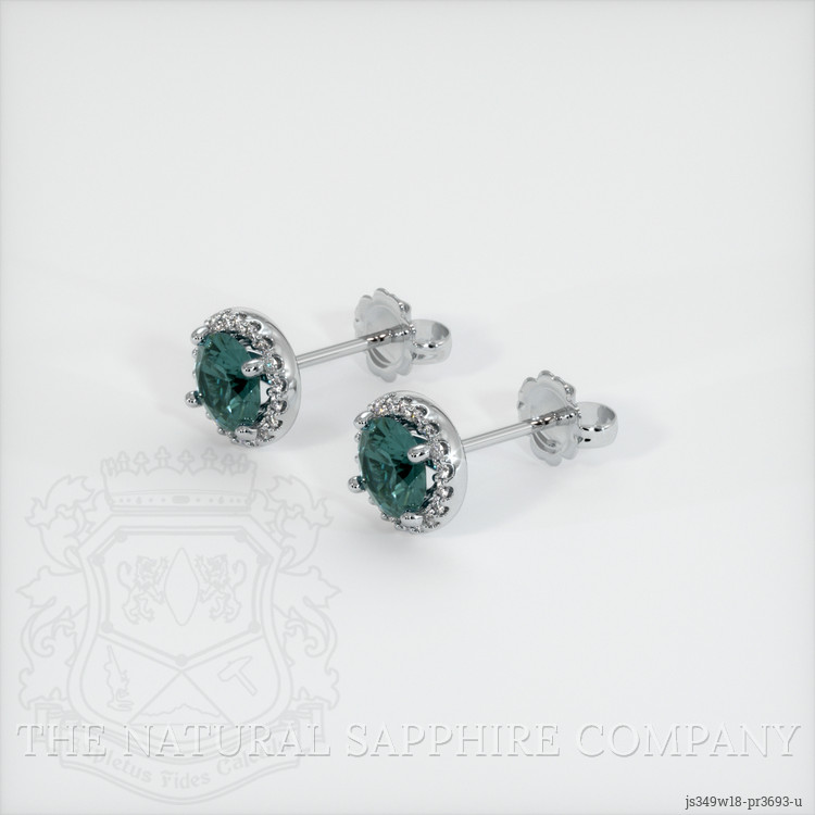 The earrings feature a beautiful, transparent pair of sapphires that are 0.94 total carat weight. They are round shape bluish green sapphires, with the dimensions of 4.53 x 4.50 x 3.18 mm and are brilliant cut, have a clarity grade of very slightly included (evaluated at eye level), vivid color saturation, and an excellent polish. The origin of this pair of sapphires is Madagascar.