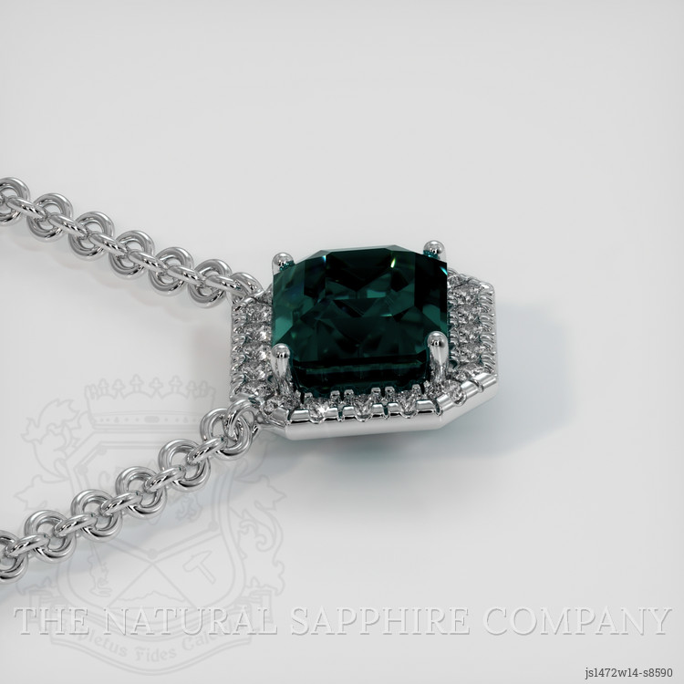The necklace features a beautiful, transparent 4.52 carat emerald cut shape bluish green sapphire with the dimensions of 9.45 x 7.88 x 5.92 mm and a emerald cut. It has a clarity grade of eye clean (evaluated at eye level), intense color saturation, and an excellent polish. The origin of this sapphire is Ceylon (Sri Lanka).
