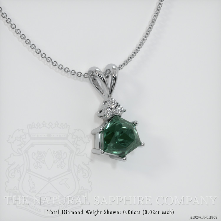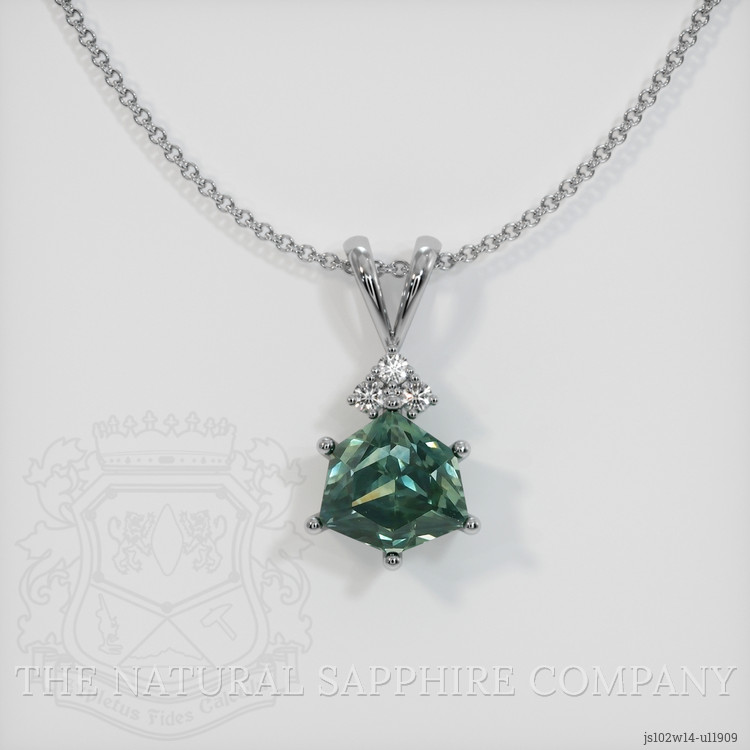 The pendant features a beautiful, transparent 2.44 carat fancy shape bluish green sapphire with the dimensions of 7.37 x 7.64 x 5.93 mm and a fancy brilliant cut. It has a clarity grade of eye clean (evaluated at eye level), intense color saturation, and an excellent polish. The origin of this sapphire is Montana.