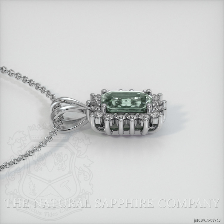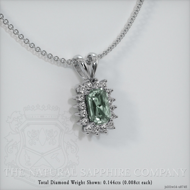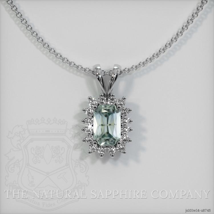 The pendant features a beautiful, transparent 0.76 carat radiant shape bluish green sapphire with the dimensions of 5.90 x 3.92 x 3.31 mm and a radiant cut. It has a clarity grade of very slightly included (evaluated at eye level), medium intense color saturation, and an excellent polish. The origin of this sapphire is Montana.