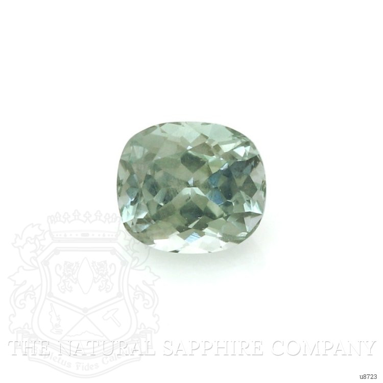 The ring features a beautiful, transparent 0.67 carat cushion shape bluish green sapphire with the dimensions of 5.13 x 4.54 x 3.37 mm and a mixed brilliant cut. It has a clarity grade of very slightly included (evaluated at eye level), medium color saturation, and an excellent polish. The origin of this sapphire is Montana.