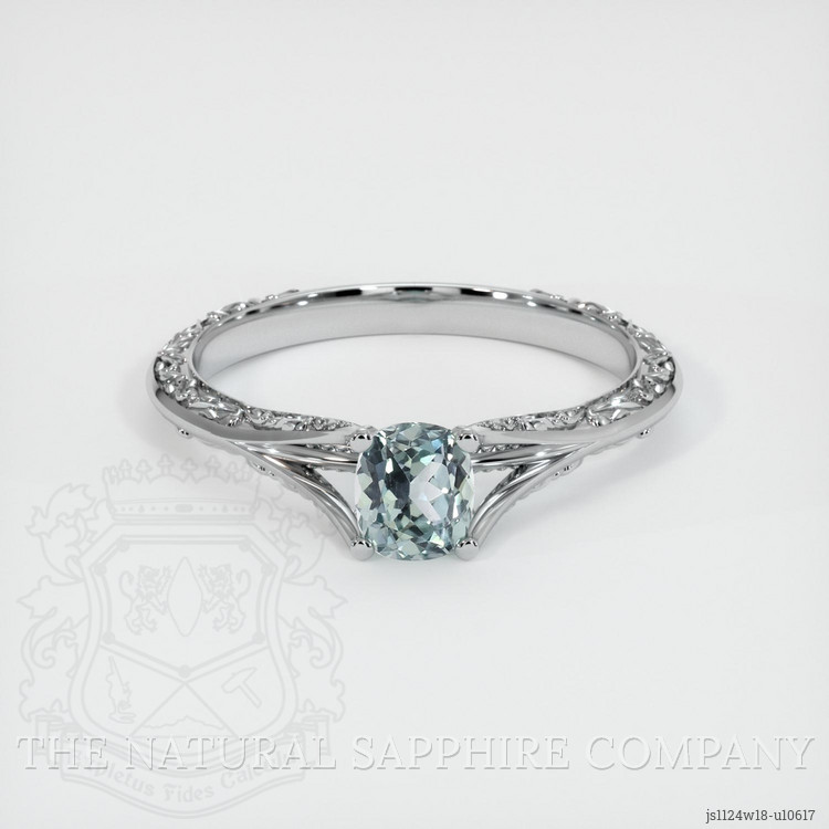 The ring features a beautiful, transparent 0.71 carat cushion shape bluish green sapphire with the dimensions of 5.37 x 4.74 x 3.32 mm and a mixed brilliant cut. It has a clarity grade of very slightly included (evaluated at eye level), medium color saturation, and an excellent polish. The origin of this sapphire is Montana.