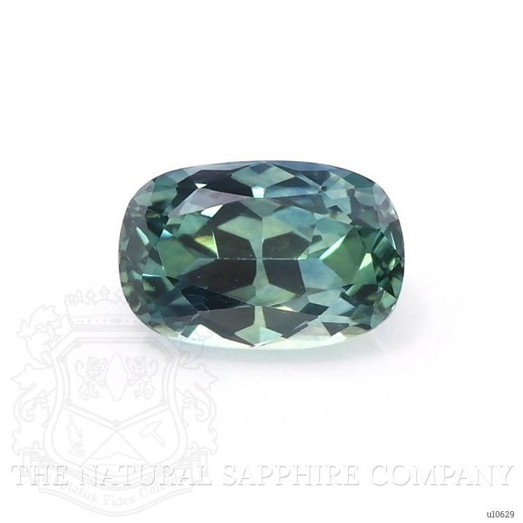 The ring features a beautiful, transparent 0.74 carat cushion shape bluish green sapphire with the dimensions of 6.47 x 4.27 x 3.11 mm and a mixed brilliant cut. It has a clarity grade of eye clean (evaluated at eye level), vivid color saturation, and an excellent polish. The origin of this sapphire is Montana.
